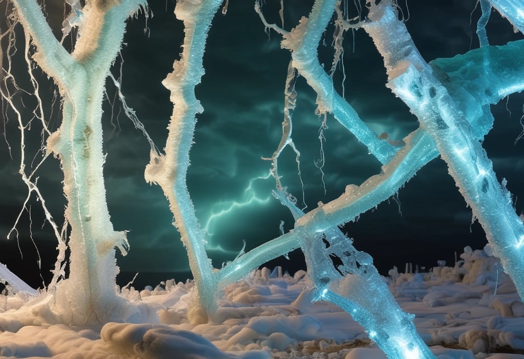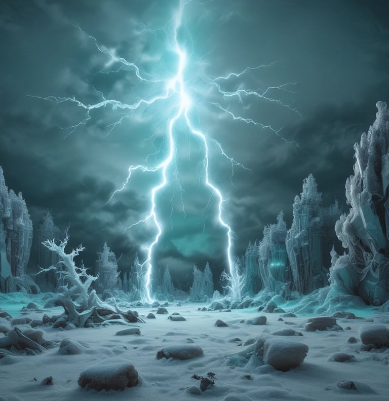 Lightning frozen mid-flash in a crystal-like structure — teal ice aesthetics.