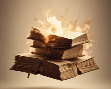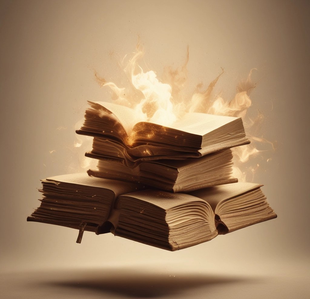 Old books floating mid-air with burning pages freezing in motion — sepia aesthetic, emotional abstraction.