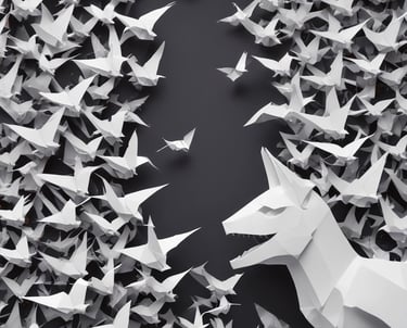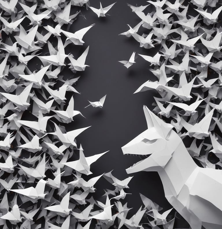 White mask disintegrating into origami birds — stark backdrop, poetic simplicity.