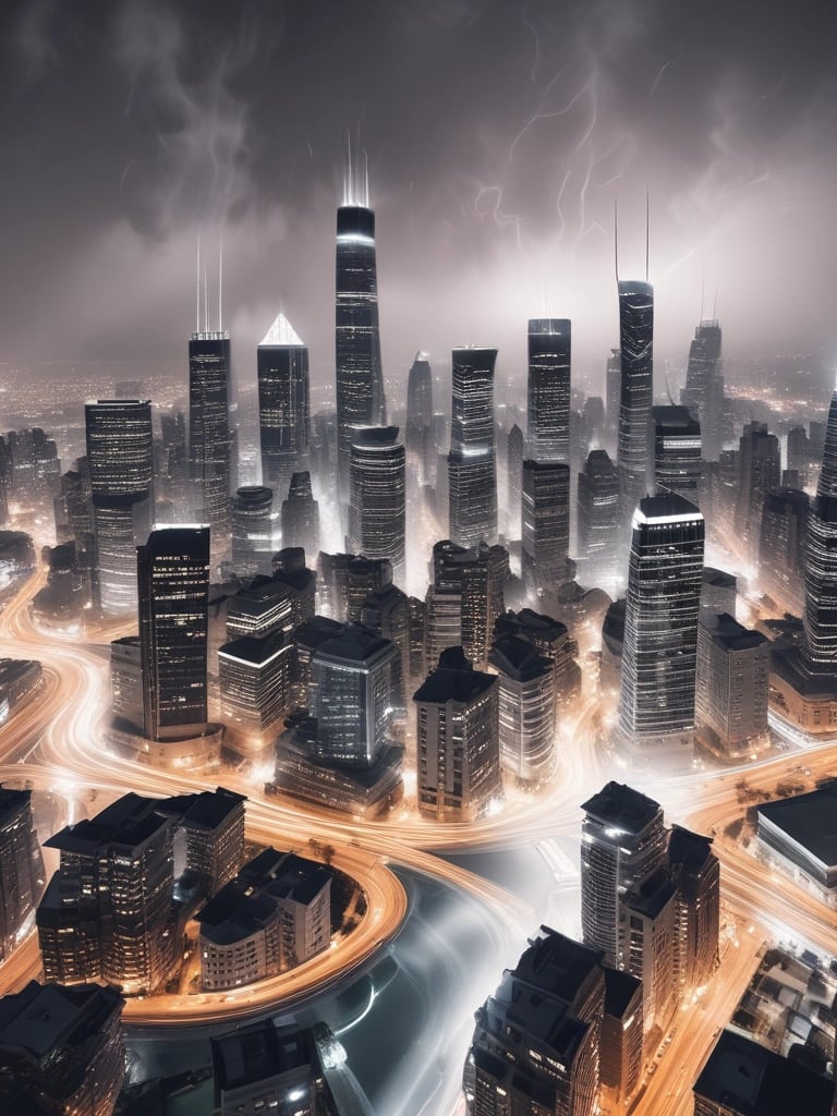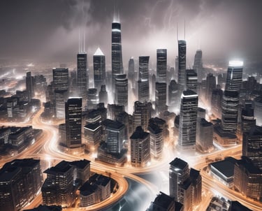 A city skyline bending and pulsing like lungs inhaling and exhaling, fog weaving through skyscrapers like veins, long-exposure trails, bioluminescent tones, surreal fine art photography.