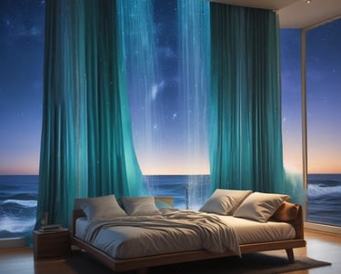 A waterfall peeling back like a fabric curtain revealing stars behind it — hyper-dreamlike simulation.