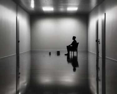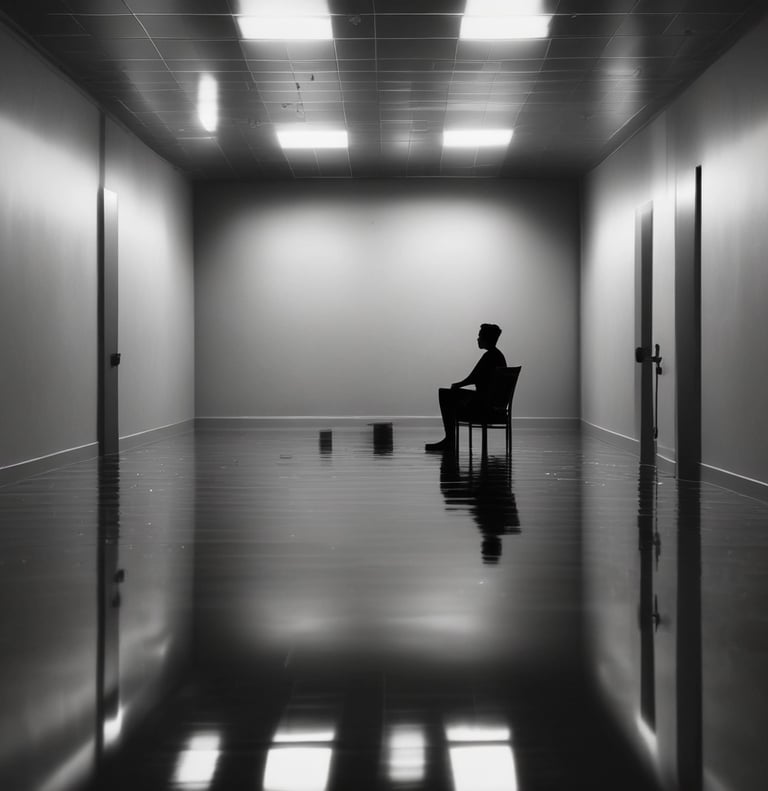 A person sitting in an empty flooded room, water reflecting their silhouette like an alternate self — dark editorial lighting, conceptual loneliness.