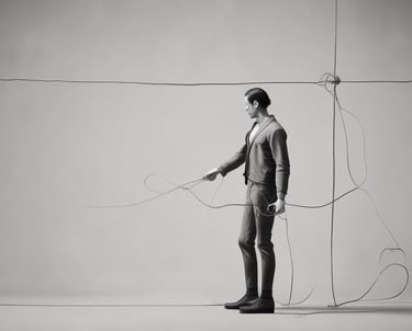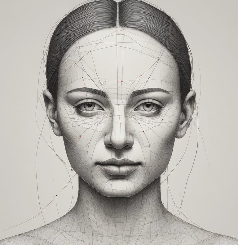 A face stitched with invisible red thread connecting to horizon — simple but deeply metaphorical.