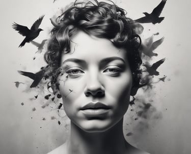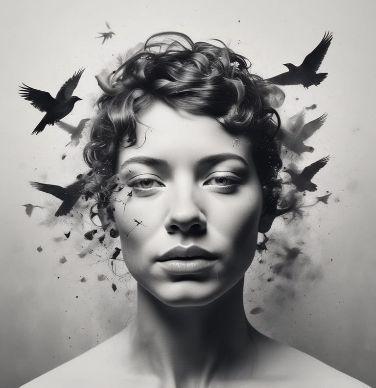 A minimalist portrait where smoke, birds, and paper fragments emerge from the subject’s head like ideas exploding outward — high key lighting, abstract narrative composition.