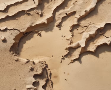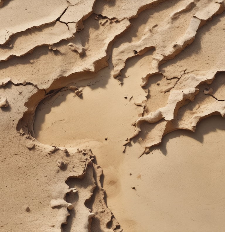 Macro shot of skin transforming into cracked desert ground with wind blowing sand, surreal texture blending, hyper-detailed close-up, metaphorical portrait.