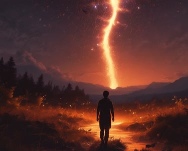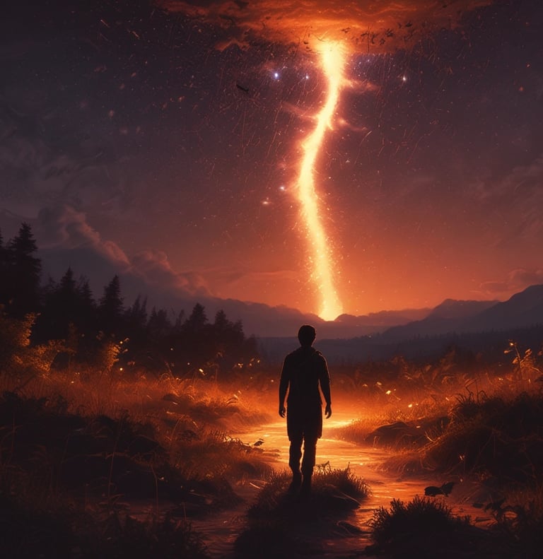 Thousands of glowing insects forming a tornado above a lone silhouette — magical chaos.