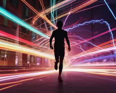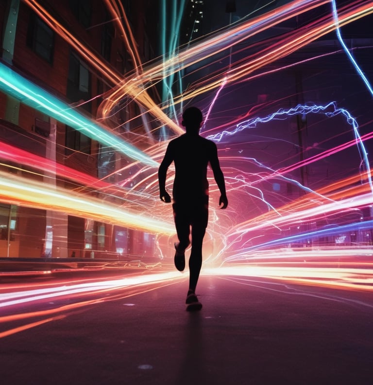 Long-exposure silhouette of a runner dissolving into neon trails across an empty street at night — chromatic aberrations, motion blur surrealism.