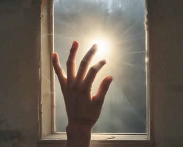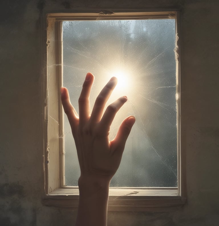 A hand reaching through cracked glass where sunlight streams in — soft ethereal glow with dust particles floating.