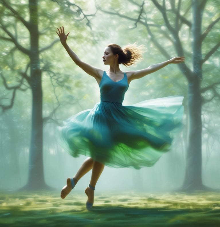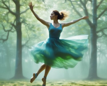Double exposure of a dancer mid-spin and a swaying tree canopy — soft blues and greens, emotional fine art style.