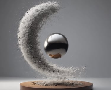 A levitating object falling apart into particles while background remains crisp — high shutter and suspended motion combined.