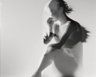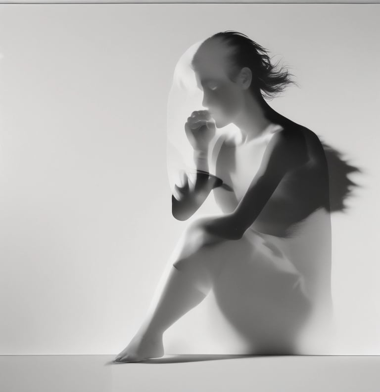 Shadow echoing outside the subject’s body, like printed twice — subtle experimental photogram style.