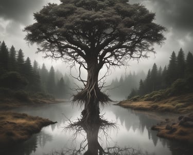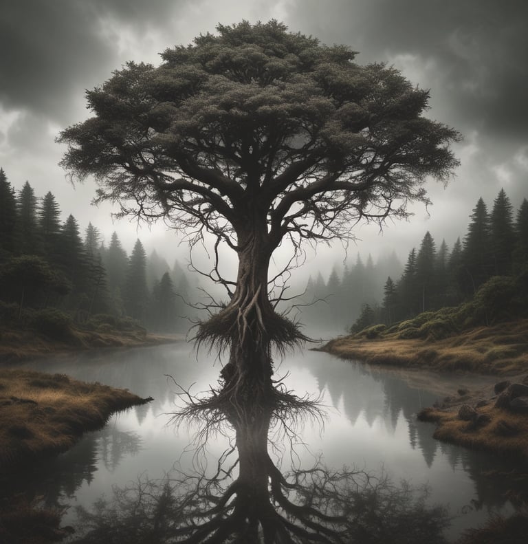 Trees growing downward from the clouds, roots dangling over horizon — inverted surreal natural landscape.