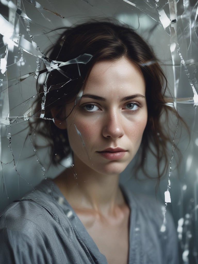 A portrait of a woman staring at her reflection in a mirror that fractures into floating glass shards, each showing a different age of her life — long-exposure light streaks, muted silver palette, dramatic depth of field — experimental conceptual photography.
