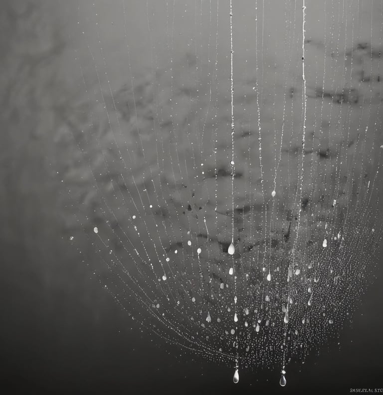 Raindrops suspended mid-air against black negative space — ultra-minimal photographic study.