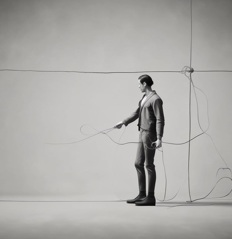 A model holding invisible heavy ropes that appear in negative exposure only — metaphor for unseen struggle.