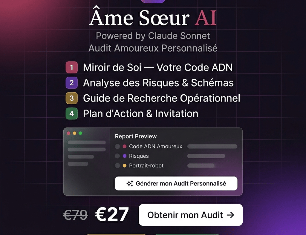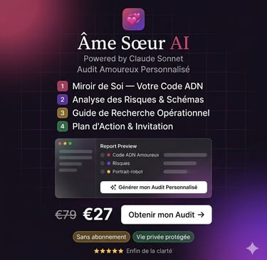 Une fois que les réponses sont fournies, "âme sœur ai" génère un rapport d'audit détaillé. Ce rapport devient une carte révélatrice, mettant en lumière les éléments manquants ou les incohérences entre les attentes personnelles et les réalités des relations passées. L'analyse fournie permet d'identifier des motifs récurrents dans les choix amoureux, d'examiner les traits de personnalité dominants et d'interroger les valeurs fondamentales qui guident les décisions affectives. Ainsi, cet outil aide à discerner non seulement ce que l'on veut dans une relation, mais aussi comprendre les raisons profondes derrière ces désirs.